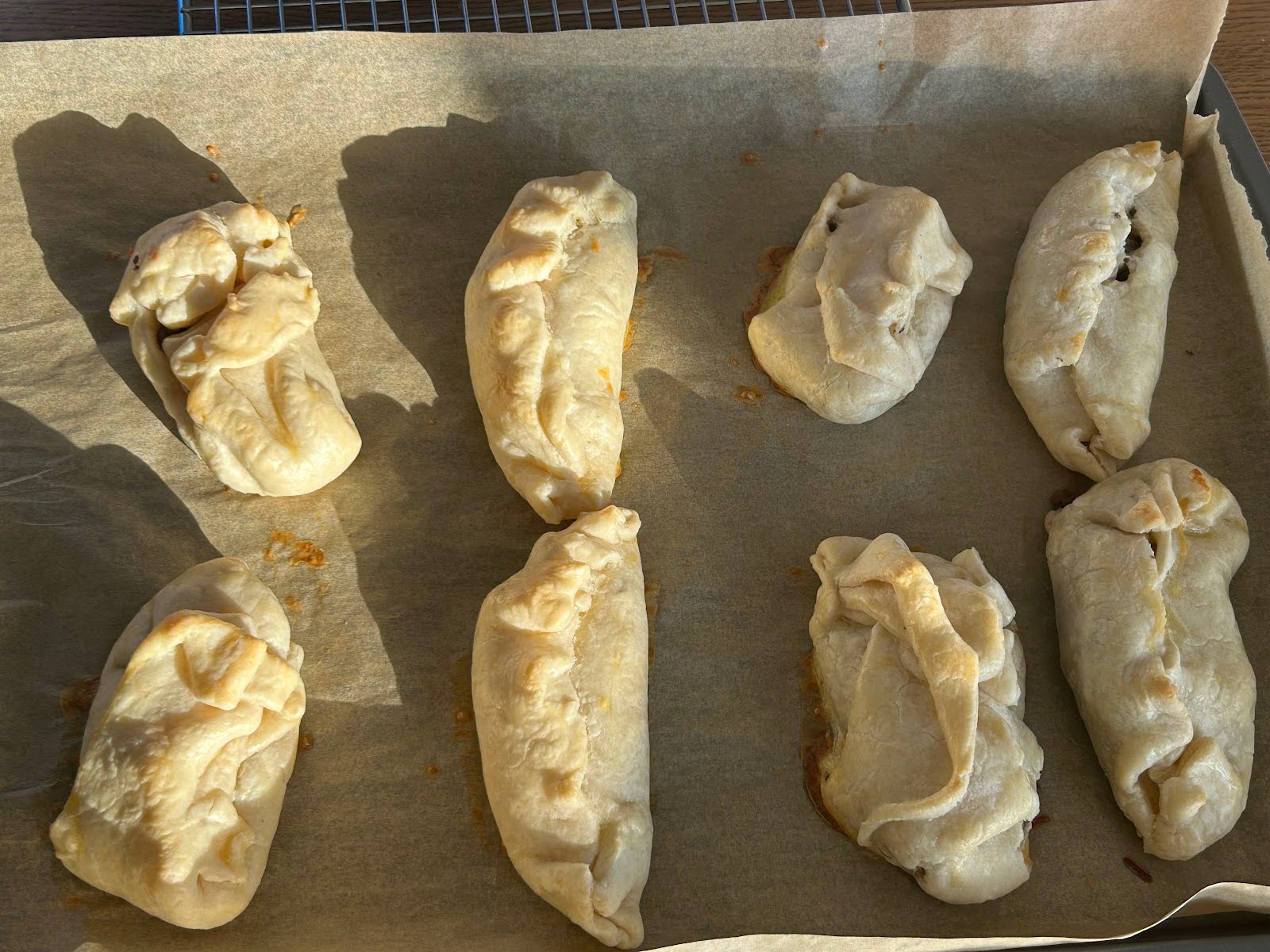 Putting the pastries together was a bit tricky. Two things to keep in mind: how much you put in and how you fold the dough over it. I followed a tip by “why I don’t season my steak but my cutting board” Adam Ragusea to wrap the meat in both sides of the dough and crimp the edges together to keep the pastry from bursting while it bakes. It worked well enough, but be careful not to tear the dough while you work. That gets harder to do the more you fill it up.