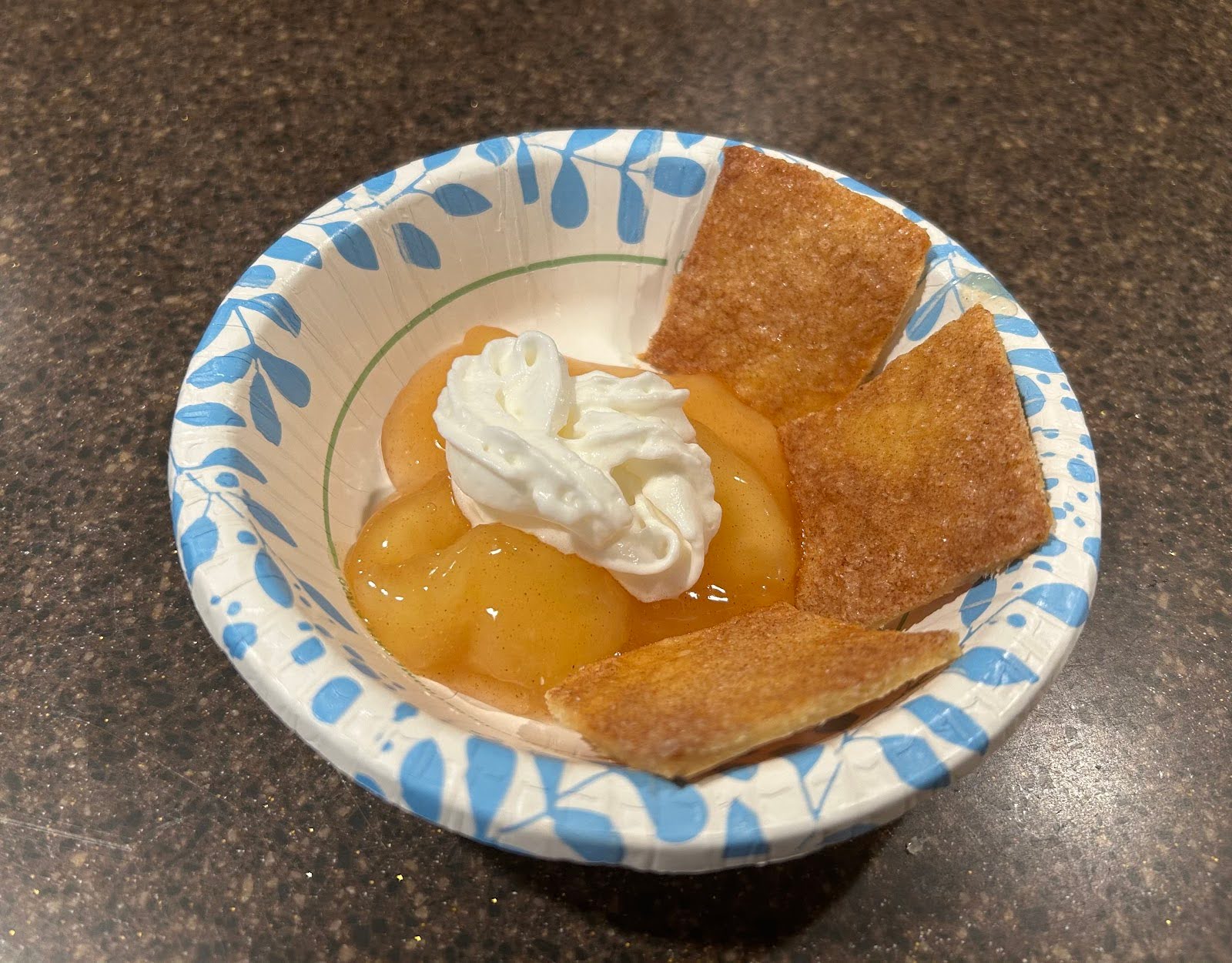 You can top it with anything you want. Classic vanilla ice cream, whipped cream, et cetera. If you want to get creative, you could even make apple pie nachos–cutting the pie crust into triangles, then layering on the filling and your toppings.