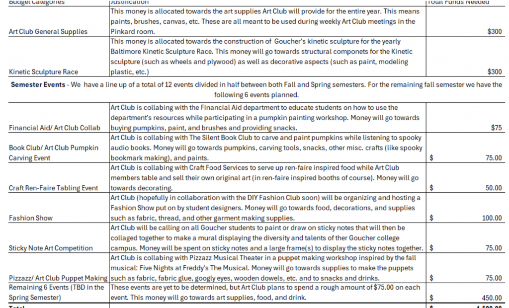 Above: Art Club budget allocation for the ‘25-26 academic year (SGA Senate Bill SB-2025-1-015-F)